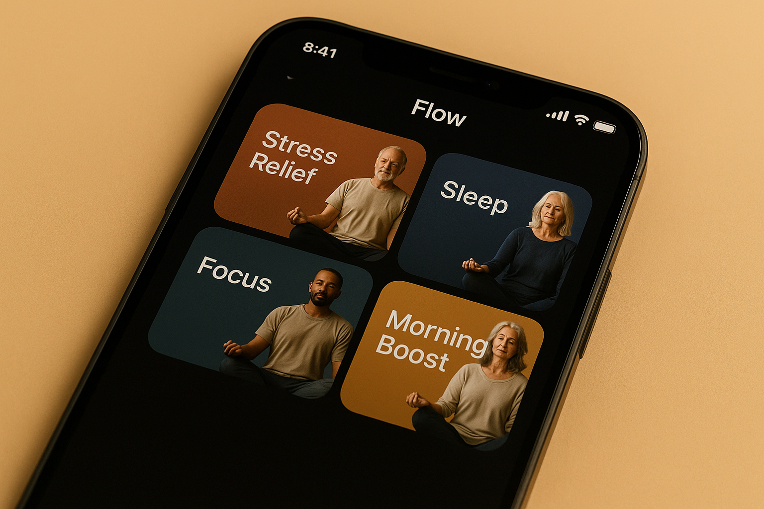 Flow rende la meditazione più facile di quanto immagini: apri l’app, seleziona il momento della giornata e il tuo obiettivo.